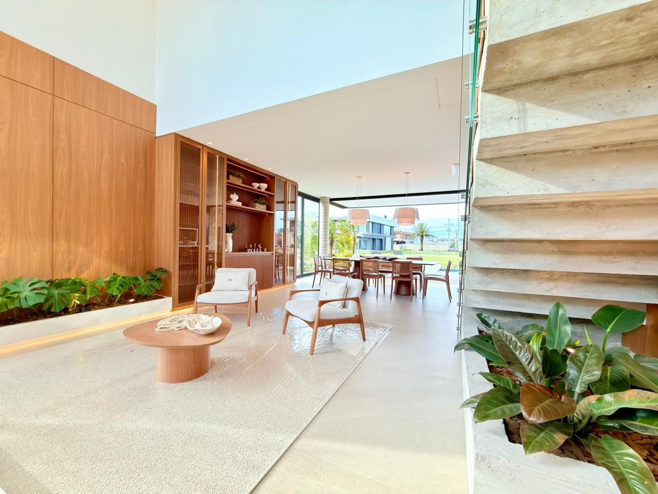 - Escada totalmente revestida em madeira natural e guarda corpo com vidro laminado 5+5